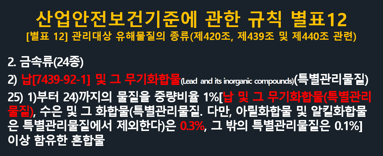- 납은 산업안전보건법에서의 특별관리물질, 화학물질관리법에서의 제한물질로 구분된다.