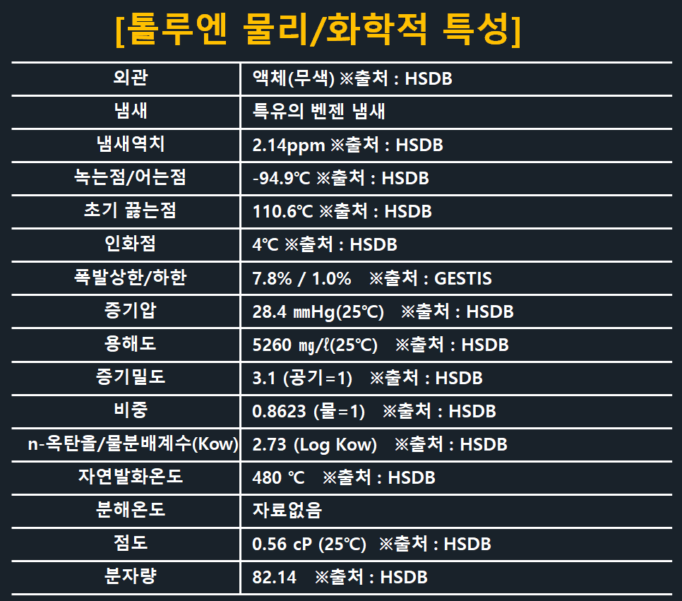 - 톨루엔은 유기용제로 인체에 여러 영향을 준다.