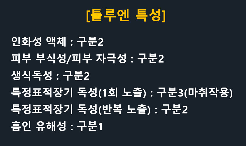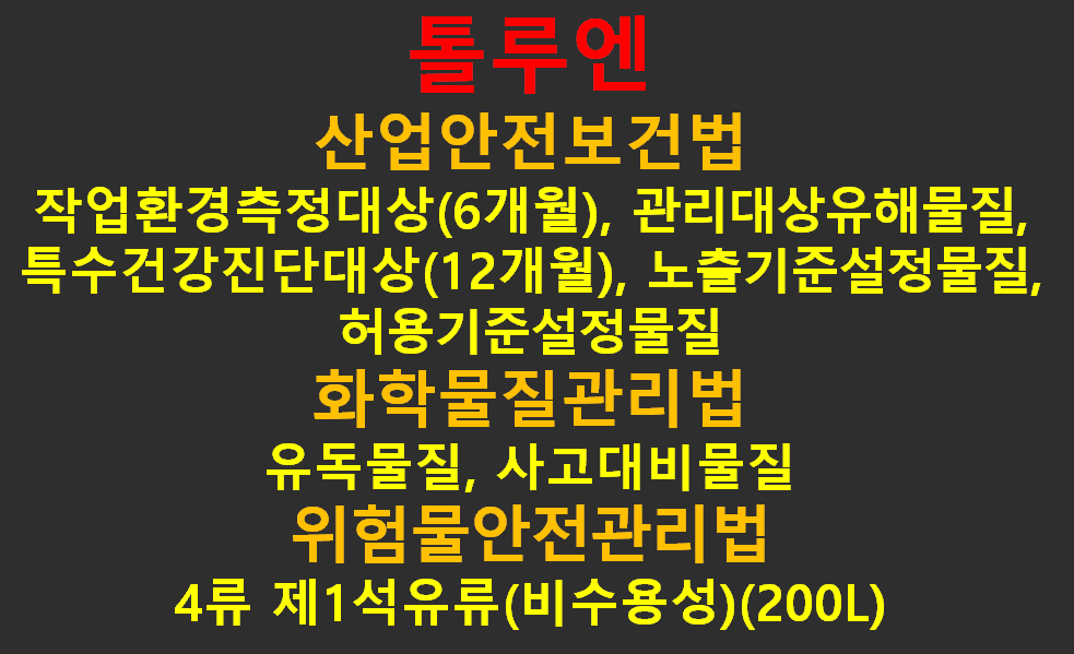 톨루엔의 경우 산업 안전 보건법에서 인화성 액체로 구분되고 있으며, 1% 이상인 경우 관리대상 유해물질로 구분된다.