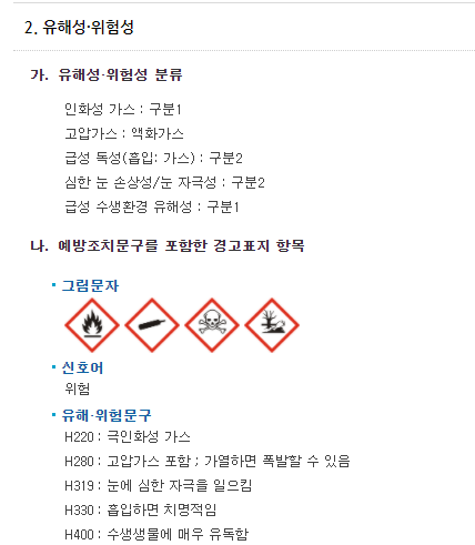 또한 화학 물질 관리법에 따라 황화수소는 사고 대비 물질, 유독물로 구분되어 유해 화학 물질에 대한 관리를 이행해야 합니다. 물질의 독성과 인화성 때문에 해당 작업장에서 작업을 하는 경우 매우 위험할 수 있으니 해당 작업장에 대한 관리 감독이 매우 중요하겠습니다.