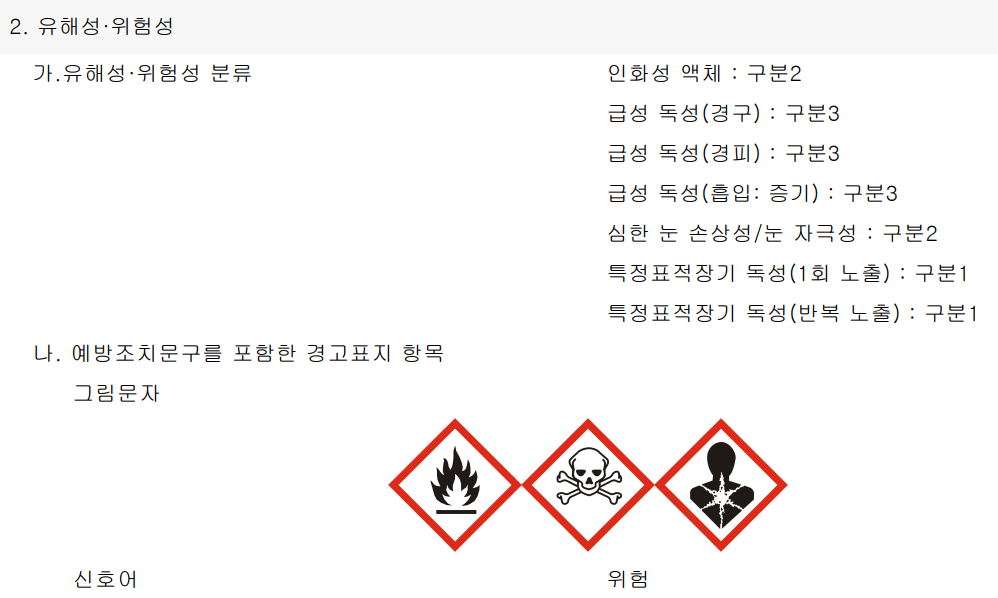 또한 안전보건공단의 물질 안전 보건 자료를 참조하여 설명하면 메탄올은 섭취하거나 흡입, 피부를 통해 체내에 흡수되는 경우 급성 독성 물질로 구분됩니다. 또한 인화성 액체이기 때문에 해당 물질을 사용하는 경우 사업장에서는 근로자의 건강뿐 아니라 폭발과 화재로 인한 사고도 충분히 대비해야 합니다.