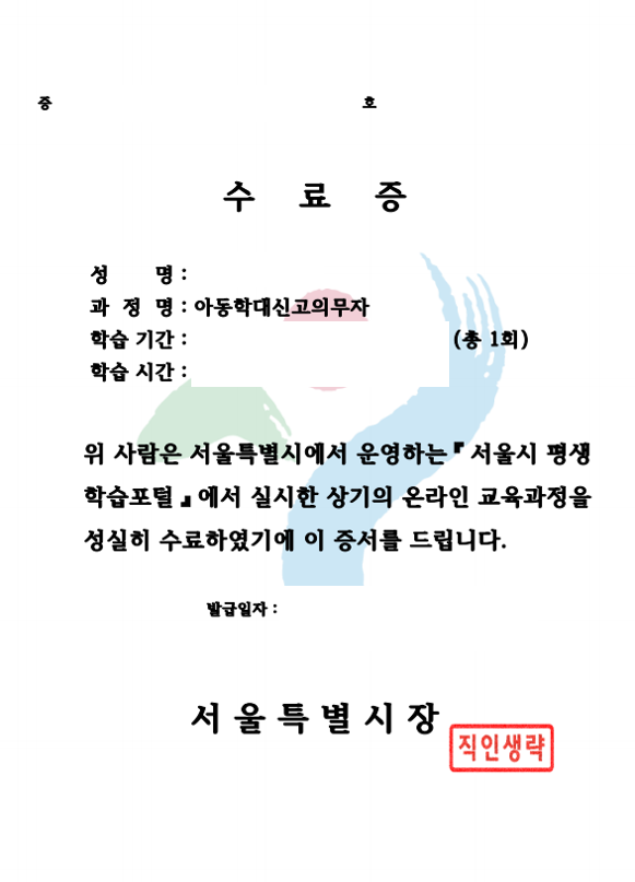 ⑦ 다운로드하면 서울 특별시장의 직인은 생략되어 나옵니다. PDF로 저장하여 메일로 담당 직원에게 보내면 올해 저의 아동학대 신고의무자 의무교육은 이수하게 되겠네요.
