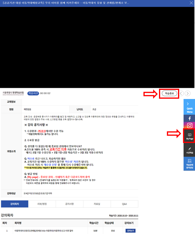⑤ 아래와 같이 동영상 강의가 진행됩니다. 58분의 교육이 끝나면 화면 하단의 학습 종료 버튼을 누르면 됩니다. 그리고 수료증을 발급받는 방법은 화면 오른쪽에 위치한 My Page에서 다운로드할 수 있습니다. 하지만 교육받은 날 바로 수령할 수 없고, 학습 기간이 종료된 이후에 수료 처리를 받아 다운로드할 수 있습니다.