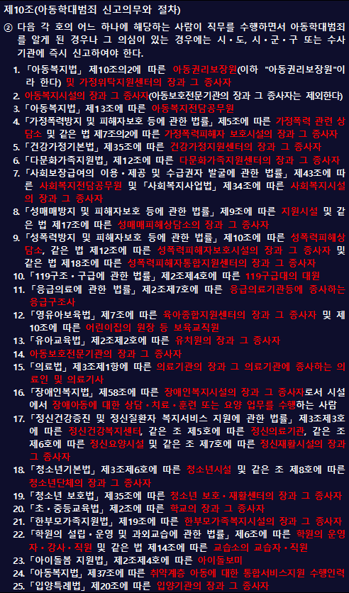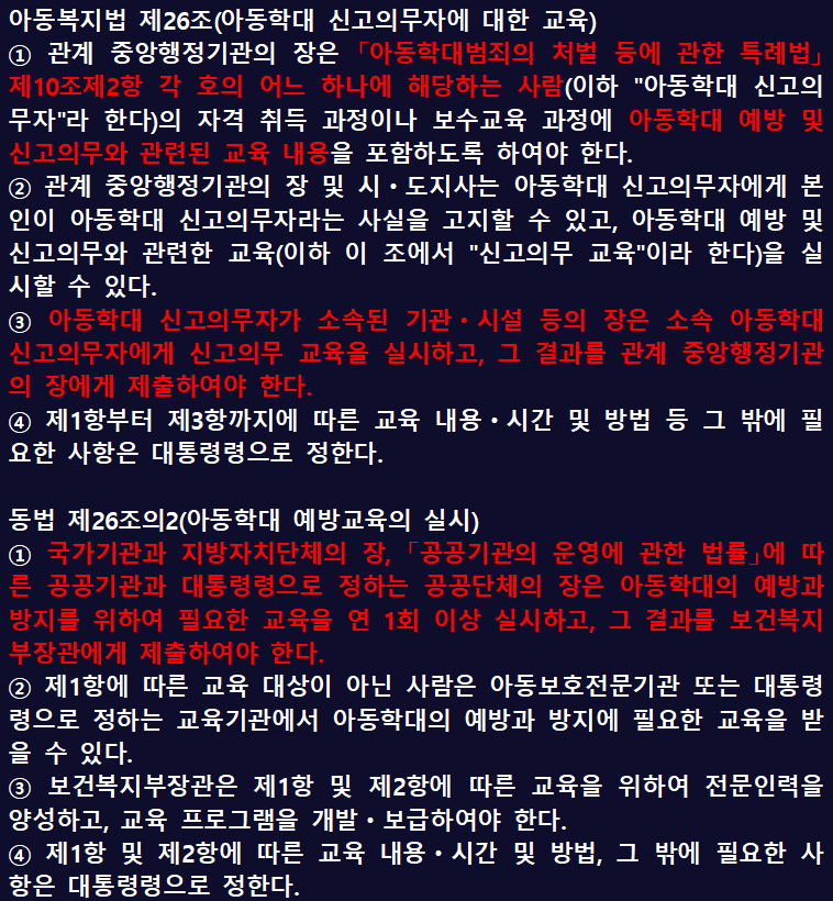 아동 복지법에 따르면 신고 의무자에 대한 교육뿐만 아니라 공공기관의 운영에 관한 법률에 따른 공공 단체에서 근무하는 대상 인원까지 모든 인원이 교육을 수료하도록 정하고 있습니다. 대상 기관과 단체는 학교와 공직유관단체까지 모든 기관을 포함하도록 하고 있습니다.