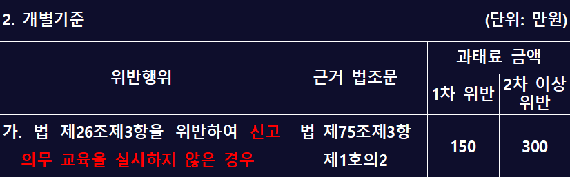 혹시라도 매년 실시해야 하는 아동교육을 실시하지 않은 경우 아동복지법 시행령 별표 17(과태료의 부과기준)에 따라 1차 위반할 경우 150만 원, 2차 이상 위반할 경우 300만 원의 과태료 대상이 됩니다. 1년에 단 1시간만 이수하면 되는 교육이기 때문에 이수하시어 과태료 대상이 되지 않도록 하기 바랍니다.
