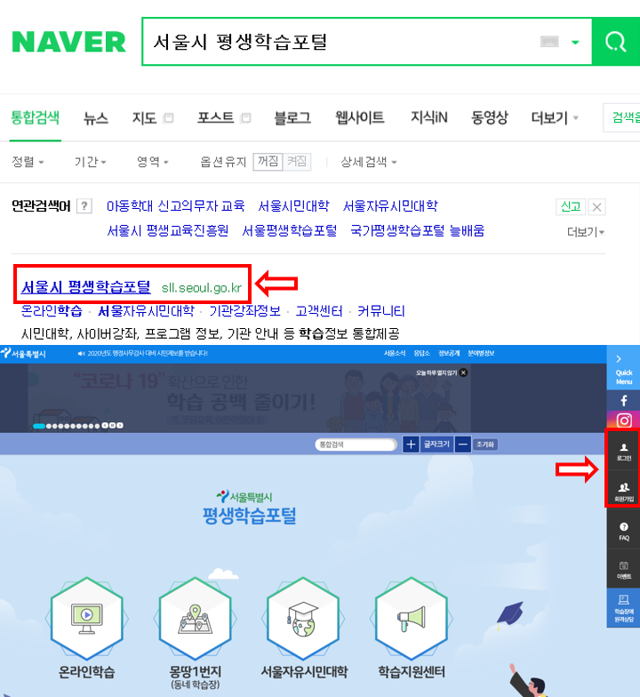① 인터넷에서 서울시 평생학습포털을 검색하거나 sll.seoul.go.kr로 바로 접속합니다. 미리 회원가입이 되어 있는 경우 로그인하시고, 회원가입이 안되어 있는 경우 회원가입 버튼을 눌러 회원 가입 하시면 됩니다.