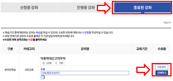 ⑥ 마이페이지의 하단부에 신청 중 강좌, 진행 중 강좌, 종료된 강좌가 있습니다. 종료된 강좌를 클릭하면 아래와 같이 아동학대 신고의무자에 대한 교육 수료증을 다운로드하거나 인쇄할 수 있습니다. 제출 방법에 따라 인쇄하거나 다운로드하여 사용하시면 되겠습니다.