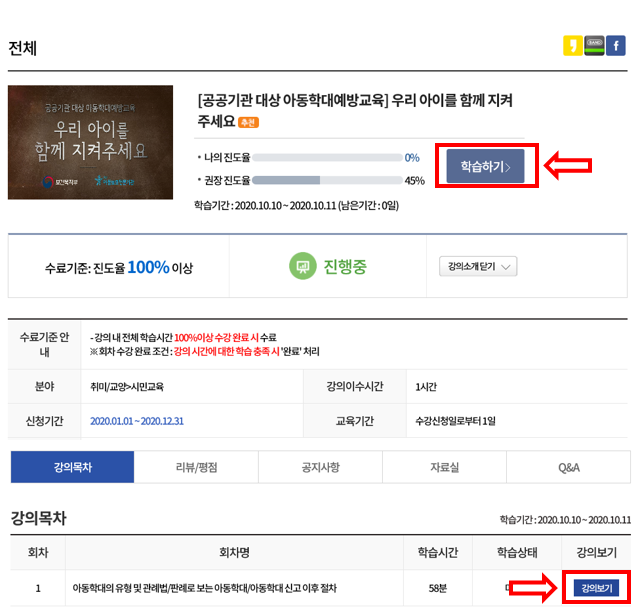 ④ 3번까지의 절차를 마무리하고 나면 학습하기 버튼을 찾을 수 있습니다. 학습하기 버튼을 누르면 아래 강의 목차에 강의 이름으로 아동학대의 유형 및 관례법/판례로 보는 아동학대/아동학대 신고 이후 철자가 나옵니다. 오른쪽 강의 보기 버튼을 누르면 동영상 강의가 시작됩니다.
