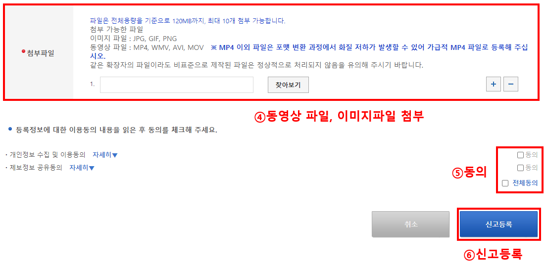 첨부파일에는 동영상 또는 그림파일을 첨부하고, 전체적인 내용을 확인 후, 개인정보 수집 및 이용 동의와 제보 정보 공유 동의에 동의 버튼을 누른 후 신고 등록을 하면 됩니다.