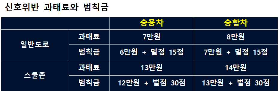 신호 위반하는 경우 일반 도로와 어린이 보호구역에서도 적용이 달라지는데요. 일반 도로에서는 벌점으로 15점을 받는 반면 어린이 보호구역(스쿨존)에서는 승용차의 경우 범칙금 12만 원에 30점의 벌점 또는 과태료는 13만 원을 받게 되며, 승합차의 경우 범칙금 13만 원에 벌점 30점 또는 과태료 14만 원을 부여받게 됩니다.