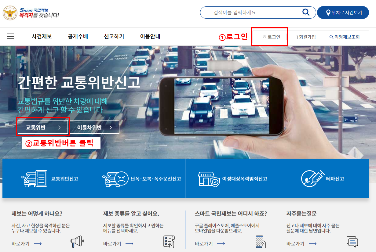 교통법규 위반을 신고하는 방법은 매우 간단합니다. 우선 스마트 국민 제보(onetouch.police.go.kr/)에 접속합니다. 회원 가입이 안되어 있는 경우 회원가입을 하고, 로그인을 합니다.