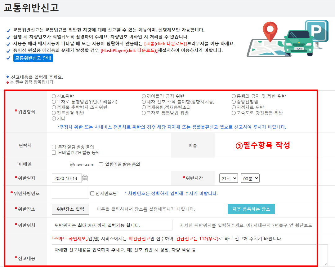 교통위반 신고 항목에 들어오면 여러 가지 항목이 있으며 그중 글 앞에 빨간색 원이 그려져 있는 필수 항목만 모두 작성하면 됩니다. 필수 항목은 위반 항목, 위반 일자, 위반차량번호, 위반 장소, 위반 위치, 신고내용과 첨부파일로 구성되어 있습니다.