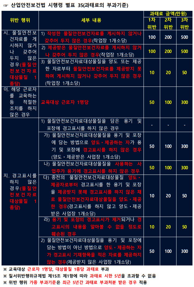 물질 안전 보건 자료 대상 물질을 사용하는 사업주가 용기에 경고표시를 하지 않은 경우 물질 1 종당 300만 원 이하의 과태료 대상이 됩니다. 1차 위반할 경우 50만 원, 2차 위반할 경우 100만 원, 3차 위반할 경우 300만 원 부과 대상입니다.