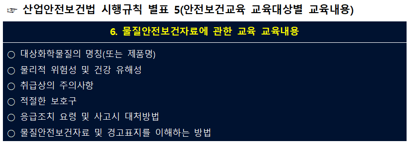 교육 항목은 총 6가지로 관련 자료는 산업안전보건법 시행규칙 별표 5(안전보건교육 교육대상별 교육내용)에 나와 있습니다. 별표 5에는 각종 교육 내용이 나와 있으며, 물질 안전 보건 자료에 관한 교육은 가장 밑 6호에 작성되어 있습니다.