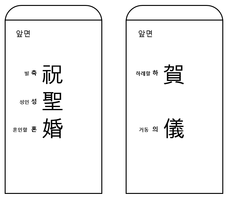 봉투의 앞면에 축 결혼(祝結婚(신랑 측)), 축 화혼(祝華婚(신부 측)), 축 성전(祝盛典), 축 성혼(祝聖婚), 하의(賀儀) 중 원하는 단어를 쓰면 되겠습니다.