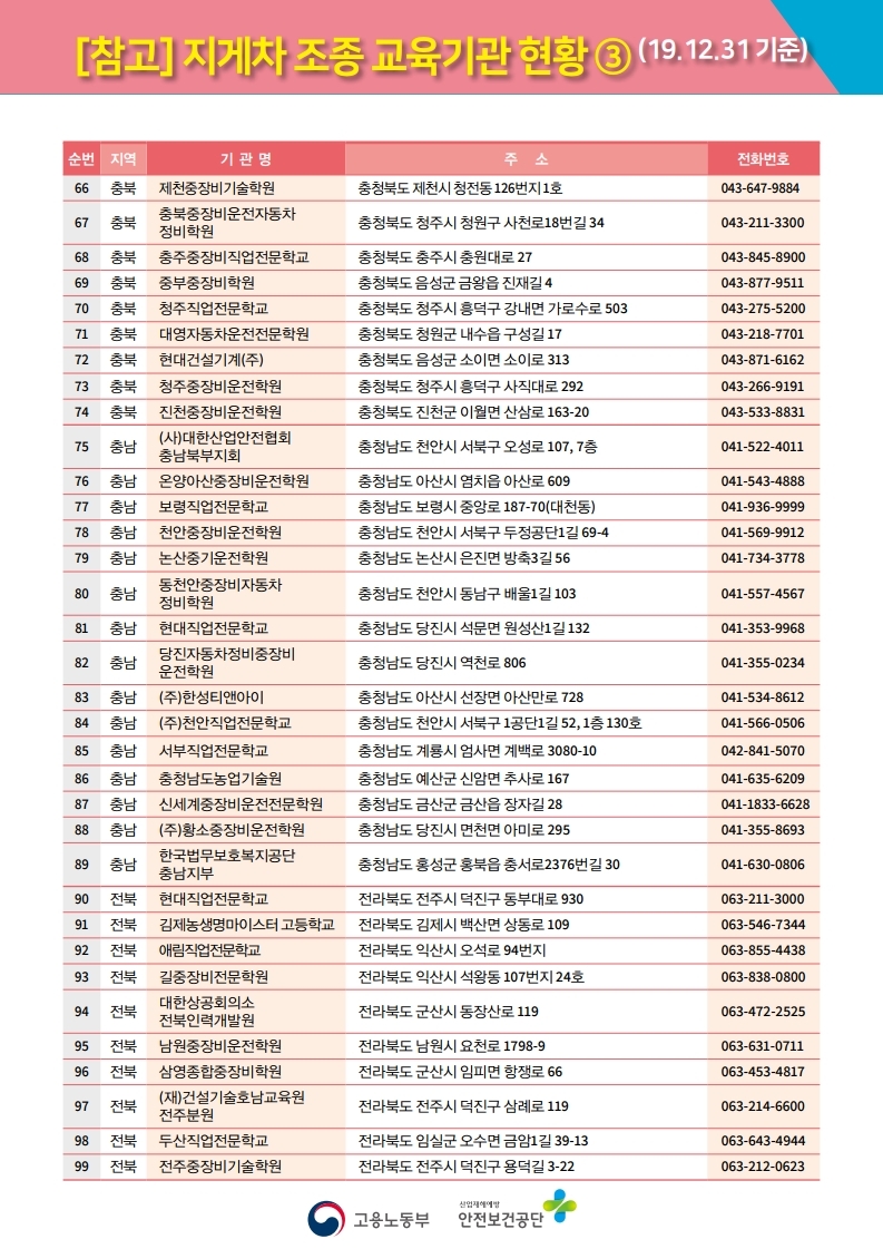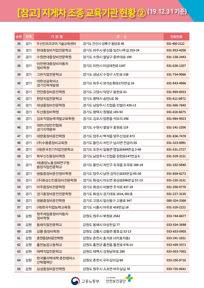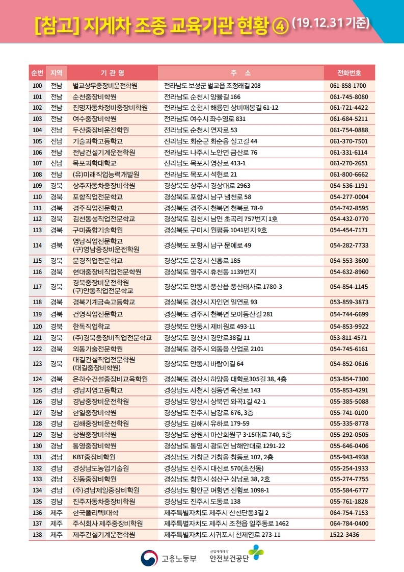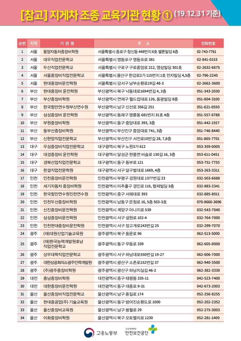 사업장의 종류도 많고 많은 교육생이 포함되다 보니 전국적으로 138개의 지게차 조종 교육기관 현황을 정해 놓았는데, 아래와 같습니다.
