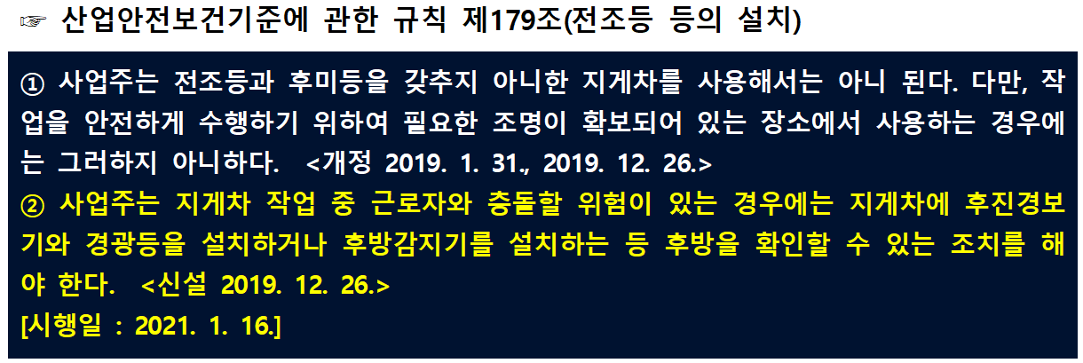 그래서 이번에 산업안전보건 기준에 관한 규칙에서 지게차에 대한 안전 조치가 강화되어 2021년 1월 16일부터 시행될 예정입니다.