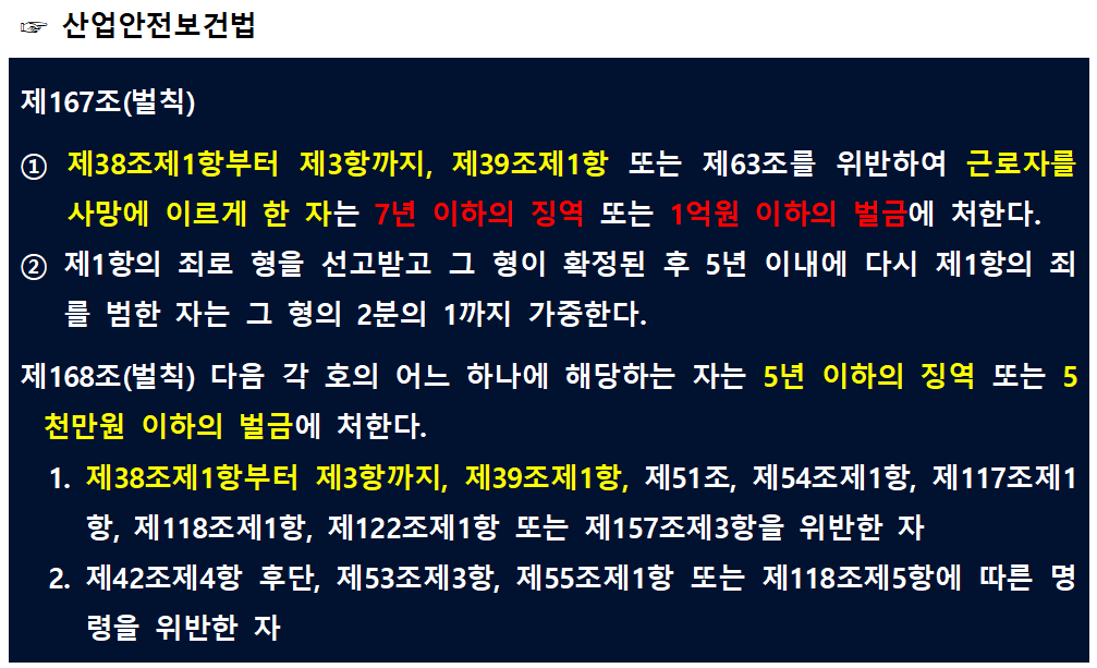 사망사고가 발생한 경우 7년 이하의 징역 또는 1억 이하의 벌금, 위반한 자는 5년 이하의 징역 또는 5천만 원 이하의 벌금이 대상이 됩니다.