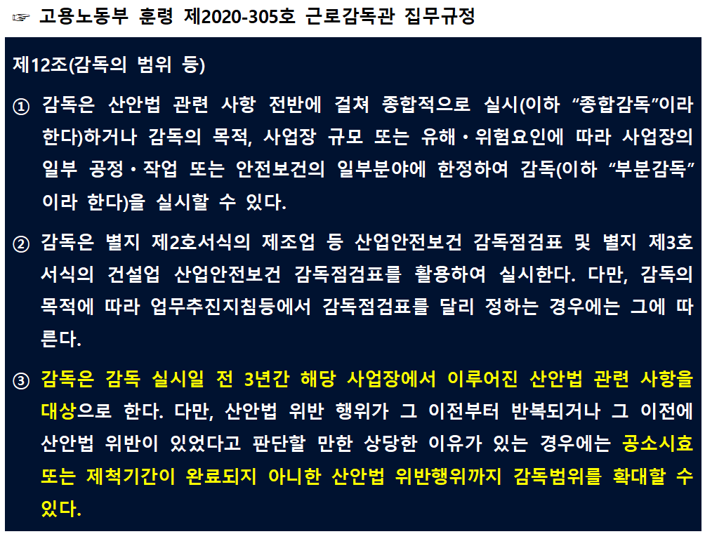 물론 근로감독관이 점검을 하게 되면 고용노동부 훈령 제2020-305호(근로감독관 집무규정)에 따라 3년의 자료만 확인을 합니다. 그렇지만 여기에서도 산안법 위반 행위가 그 이전부터 반복되거나 그 이전에 산안법 위반이 있었다고 판단할 만한 상당한 이유가 있는 경우에는 공소시효 또는 제척기간이 완료되지 아니한 산안법 위반행위까지 감독 범위를 확대할 수 있다고 정하고 있습니다.