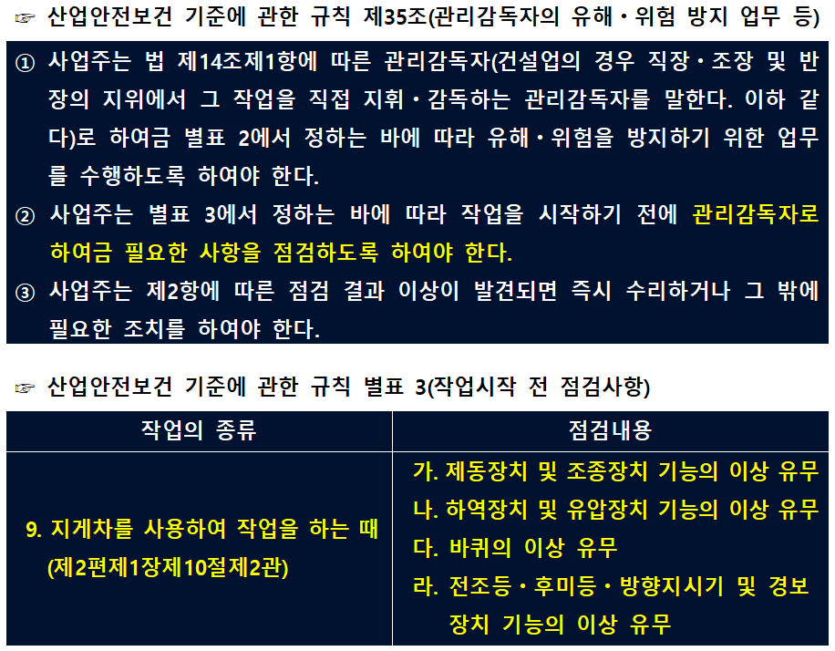 우선 산업 안전보건 기준에 관한 규칙 제35조에 따라 관리감독자는 작업 시작 전 점검을 하도록 정하고 있습니다. 지게차에 대한 점검은 지게차 운전자가 아닌 관리 감독자의 직무이기 때문에 지게차 운전자가 점검 후 관리 감독자의 서명을 받는 것이 아니라 관리감독자 본인이 직접 점검을 실시해야 합니다.