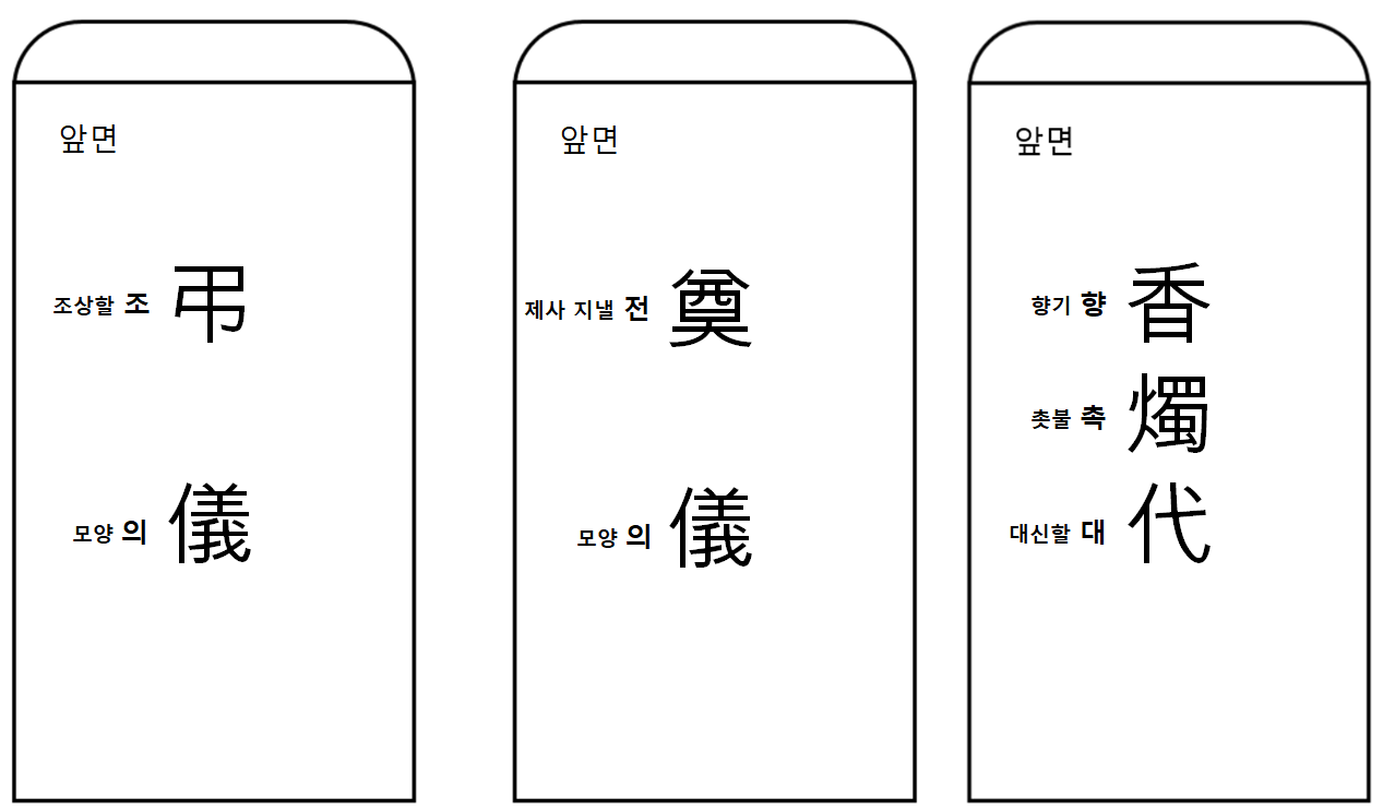 일반적으로 조의금 봉투에는 부의(賻儀)라고 작성하는 것이 많으며, 근조(謹弔), 조의(弔儀), 전의(奠儀), 향촉대(香燭代)라고 쓰기도 합니다.