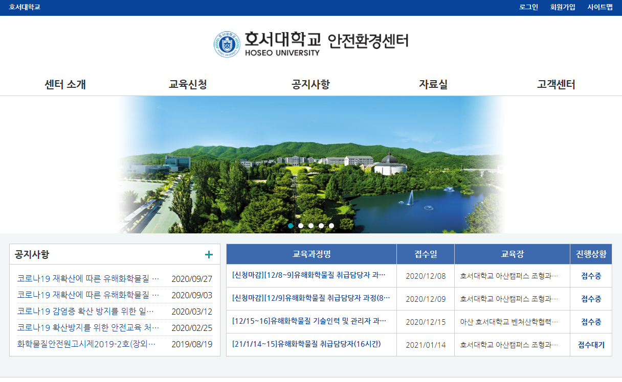 현재 교육기관은 한국화학물질관리협회, (사)한국화학안전협회, 사단법인 한국환경기술인협회, 호서대학교 산학협력단으로 총 4곳이며, 교육 일정 및 장소를 확인하고 편한 일정을 골라 교육을 이수하면 되겠습니다.