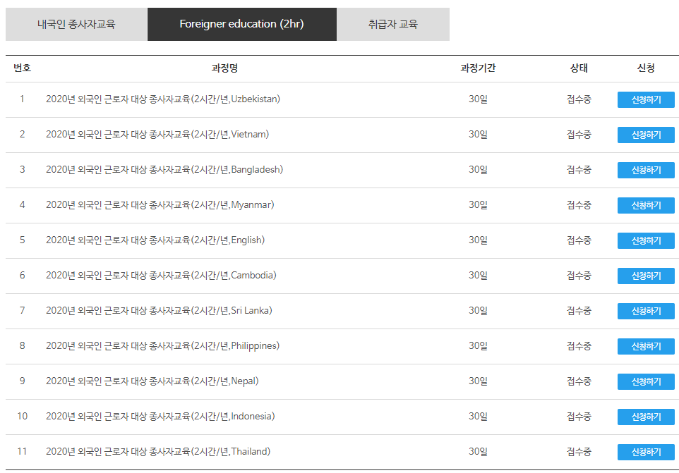 화학물질안전원 교육 시스템에서는 온라인 교육 중 내국인 종사자 교육(2시간), 외국인 교육(2시간), 취급자 교육(16시간 중 8시간)을 제공하고 있습니다. 사업장에서 필요에 따라 교육을 선택하고 이수하면 되겠습니다.