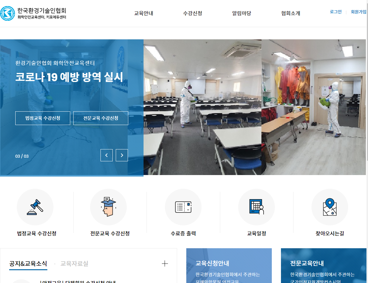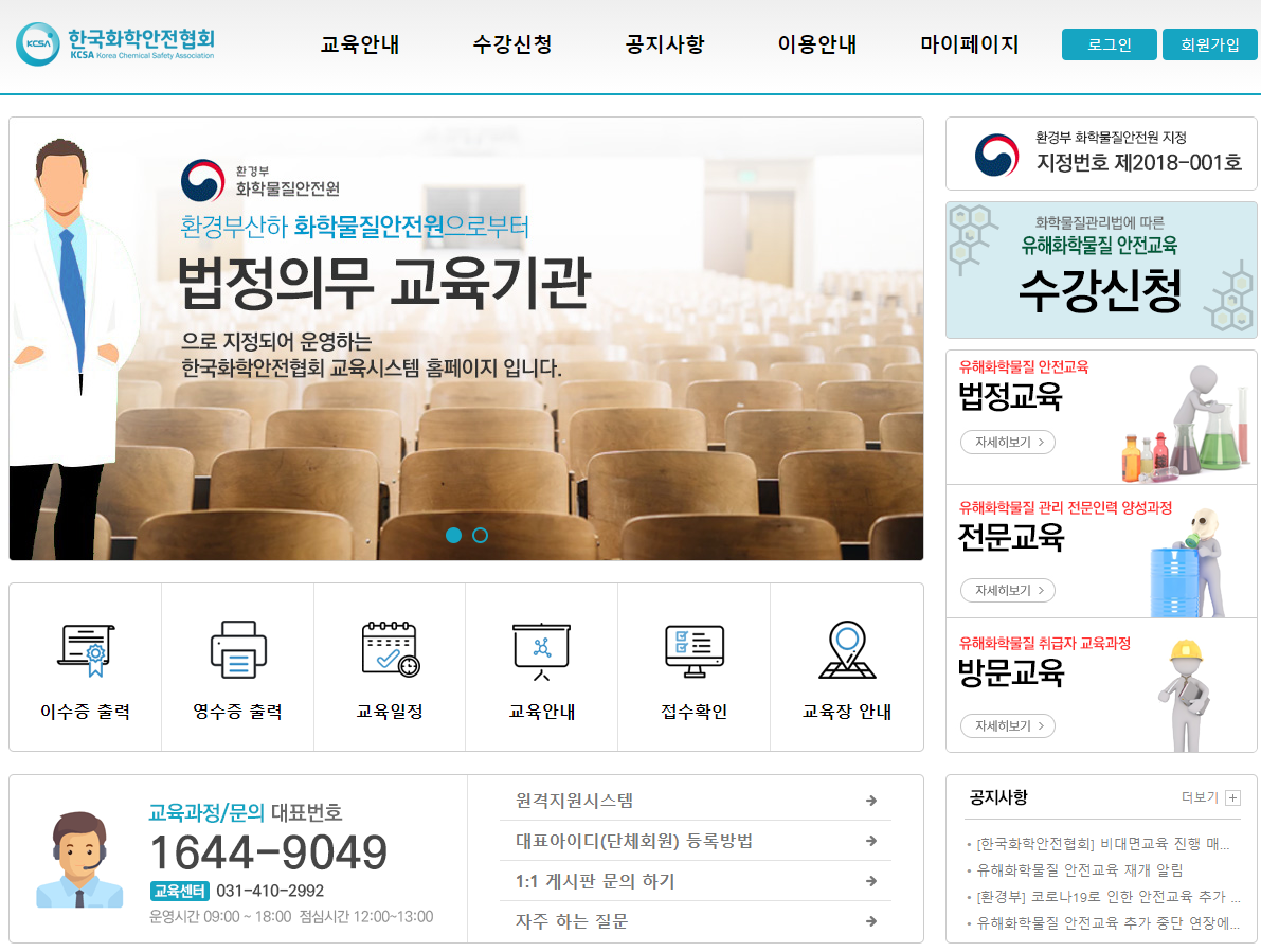 화학물질안전원 교육 시스템에 접속하면 온라인 교육으로 취급자 교육 8시간, 국내 종사자 교육 2시간을 이수할 수 있습니다. 법에 따라 취급자 교육 16시간 대상인 경우 8시간은 온라인으로 해도 인정해 주기 때문에 온라인으로 하는 경우도 많습니다.