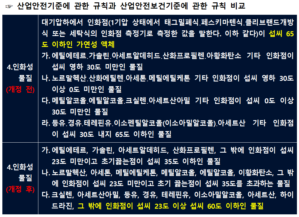 위처럼 우리나라의 기준은 원래 65℃가 기준이었습니다. 하지만 2011년 7월 6일 산업안전기준에 관한 규칙과 산업보건 기준에 관한 규칙이 하나로 합쳐지며 고용노동부령 제30호에 따라 전부 개정되었는데요. 이 과정을 거치면서 인화성 액체의 기준이 65도에서 60도로 바뀌게 되었습니다.