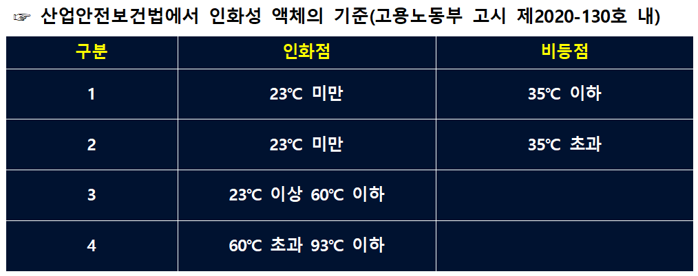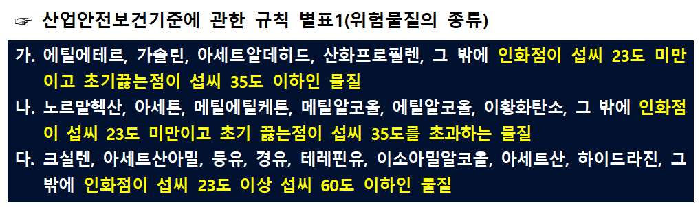 결국 인화점이 60도 이하인 경우 산업 안전 보건법에서는 인화성 액체로 구분하며, 그에 따른 안전관리를 요구하고 있습니다.