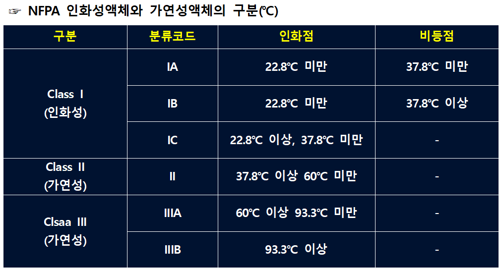 전 세계에서 하나의 기준으로 변화를 추구하고 있다 보니 우리나라에도 마찬가지로 세계의 기준에 따라야만 하지 않았을까 싶은데요. 기준을 잡다 보니 미국방화협회(NFPA, National Fire Protection Association) 규정 중에 있는 NFPA 30 Flammable and Combustible Liquids Code에서 정하는 인화성 액체(Flammable Liquids)와 가연성 액체(Combustible Liquids)의 기준을 따르지 않았나 생각됩니다.