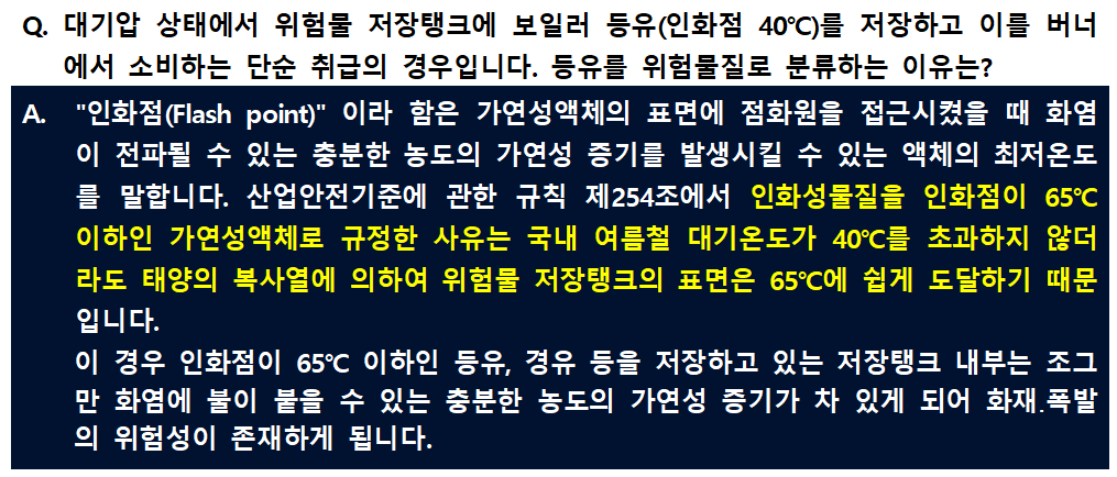 과거 등유의 인화성 액체에 대한 질의 회시 자료를 확인해 보면, 여름철 대기 온도와 별개로 태양의 복사열에 의해 저장탱크의 표면이 65℃에 쉽게 도달하기 때문이라는 답변이 있습니다. 법적 기준을 65℃로 정했던 이유가 여기 있는 것 같네요.