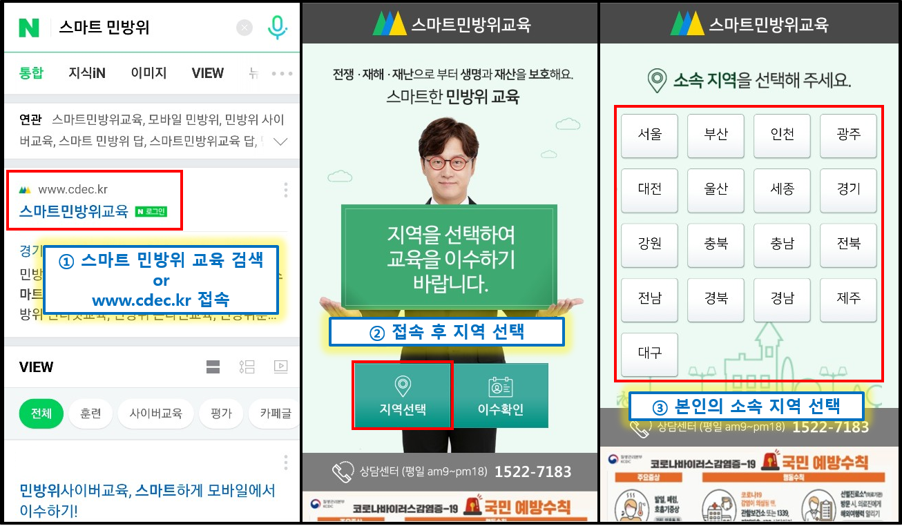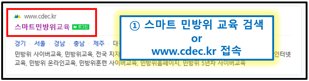 민방위 교육을 받기 위해 포털에서 『스마트 민방위 교육』 또는 바로 http://www.cdec.kr로 접속합니다. 접속 후 지역 선택을 눌러 본인이 소속된 지역을 선택합니다.