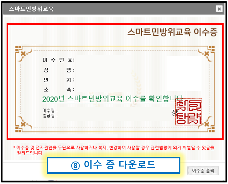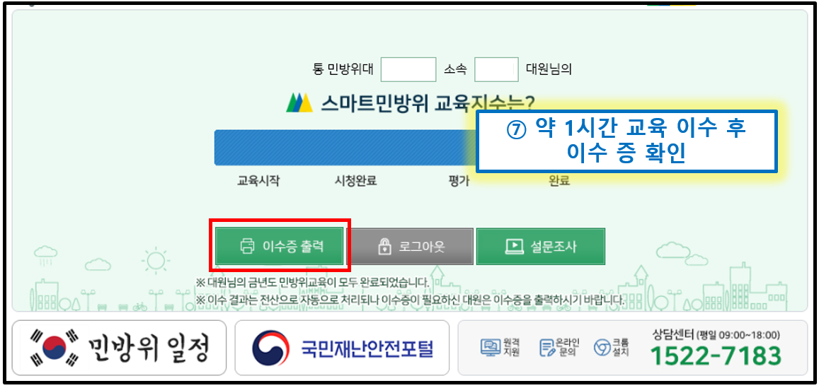 로그인을 하면 약 1시간의 동영상 강의가 시작되고, 동영상 강의가 종료되면 『모든 교육이 완료되었습니다.』라는 화면과 이수증을 확인할 수 있는 창이 뜨게 되고, 정식적인 민방위 온라인 교육을 이수하게 됩니다.