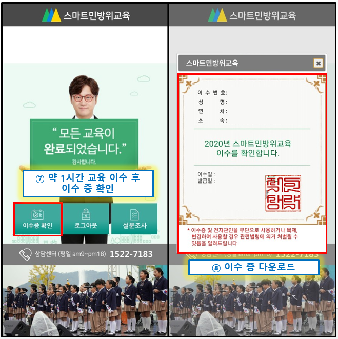 스마트폰만 있으면 민방위 교육을 수료할 수 있습니다. 모바일로 교육을 이수하는 방법은 다음과 같습니다.