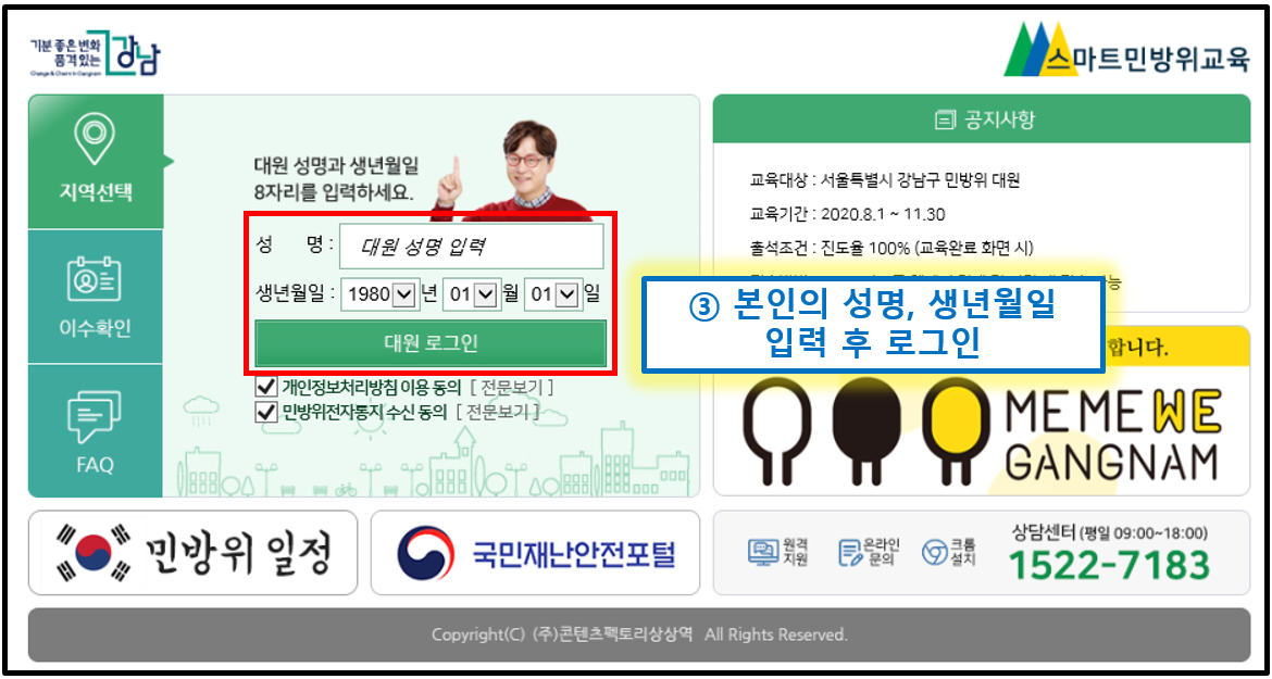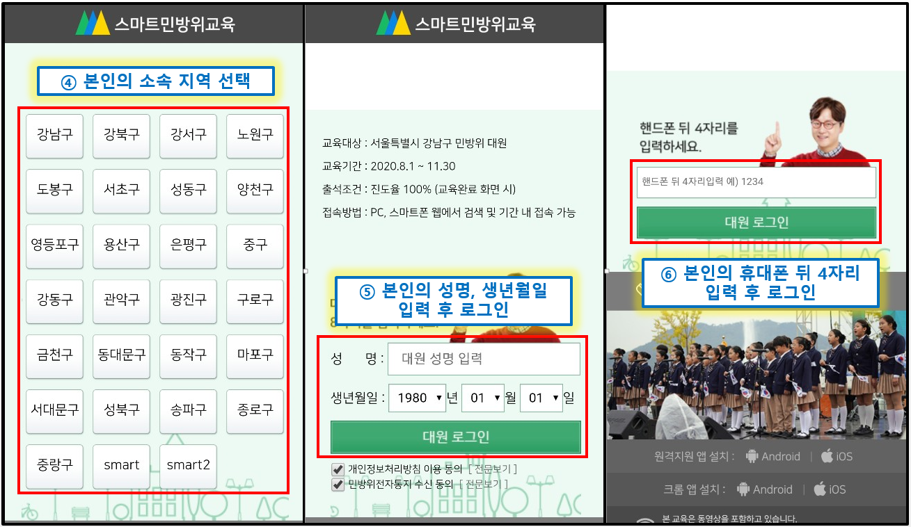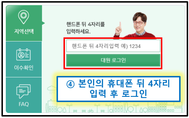 세부 지역까지 선택하면 로그인 창이 뜨게 됩니다. 성명과 생년월일을 입력하고 대원 로그인 버튼을 누르면, 다음 창으로 넘어가게 되고, 휴대폰 뒤 4자리 번호를 입력 후 로그인할 수 있습니다.