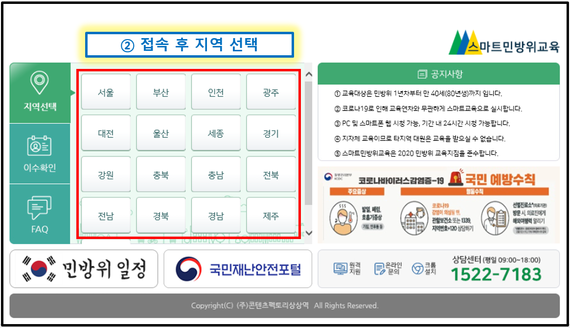 우선 스마트 민방위 교육 사이트에 접속합니다. 그 후 교육과 관련하여 본인이 소속된 지역을 선택합니다.