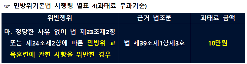 민방위 기본법 시행령 별표 4(과태료 부과기준)에 따라 민방위 교육 훈련에 관한 사항을 위반한 경우 과태료 10만 원이 부과됩니다. 교육을 받기 싫은 경우 받지 않고 과태료를 내도 크게 문제가 되지는 않겠으나, 한 시간에 대한 대가로 10만 원은 생각보다 큰 금액이네요.