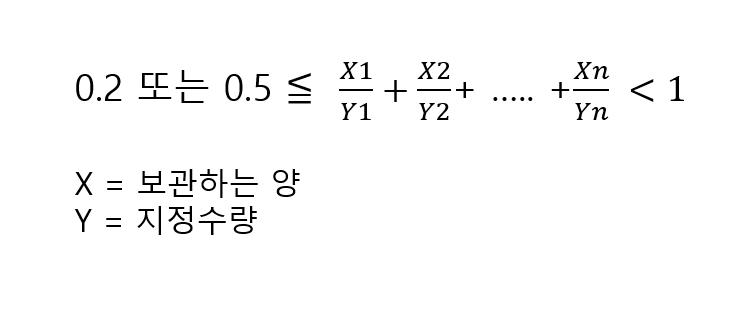 위의 식과 마찬가지로 지정수량에 대한 위험물의 비의 합이 1 미만이면서 0.5 이상(인천, 경기) 또는 0.2(그 외 지역) 이상이면 대상이 되겠습니다.