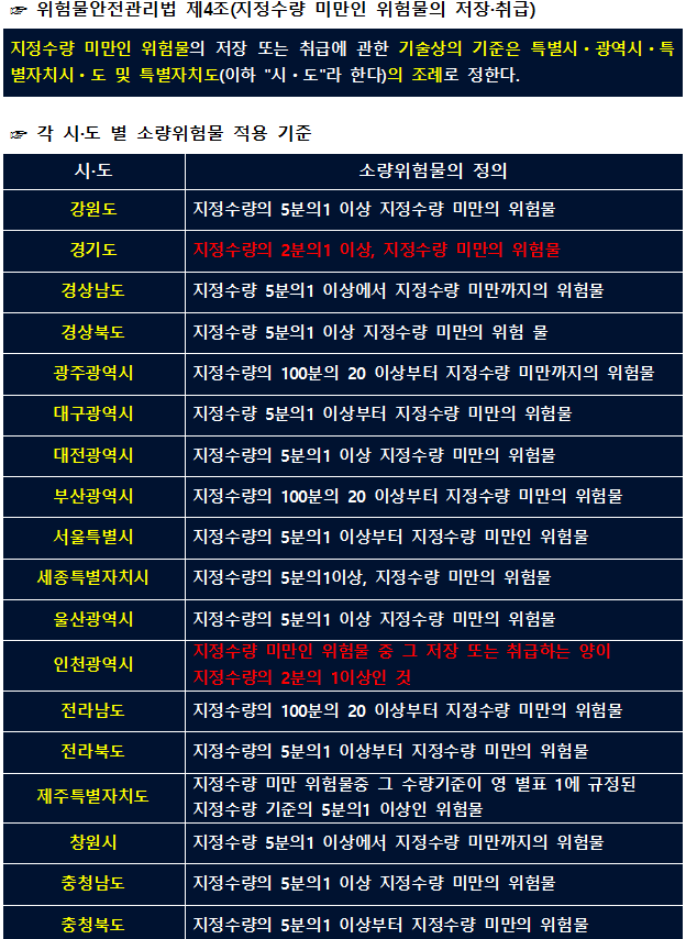 법에 따르면 지정 수량 미만에 대한 언급만 해 놓고 소량 위험물의 기준은 다시 시·도로 넘겼습니다. 이렇게 되다 보니 우리나라 각종 시와 도에서는 소량 위험물에 대한 기준을 다시 정하고 그에 따라 관리를 하도록 조례를 만들어 놓았습니다.