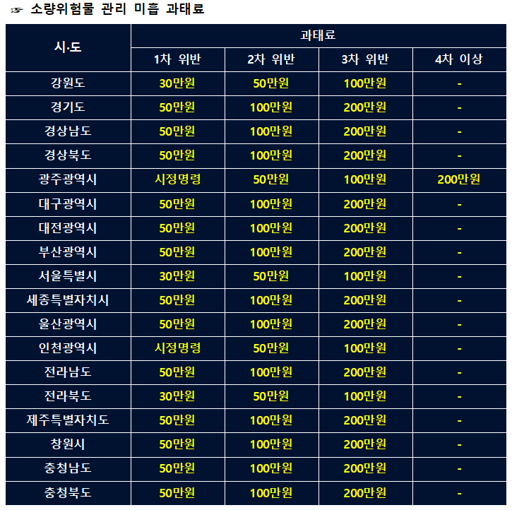 위험물 안전 관리법에 따라 시·도에 소량 위험물에 대한 사항은 위임되었습니다. 그래서 이에 따라 조례를 따르지 않은 경우 과태료 대상이 되는데요. 각 지역마다 과태료 금액은 다음과 같습니다.