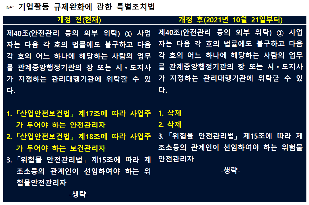 법 상 전담 인력을 선임해야 했지만, 기업 활동 규제완화에 관한 특별조치법에 따라 안전 관리자와 보건 관리자 등을 관리 대행기관에 위탁할 수 있었습니다. 하지만 2020년 10월 20일 법 일부 개정에 의한 변경이 있었습니다.