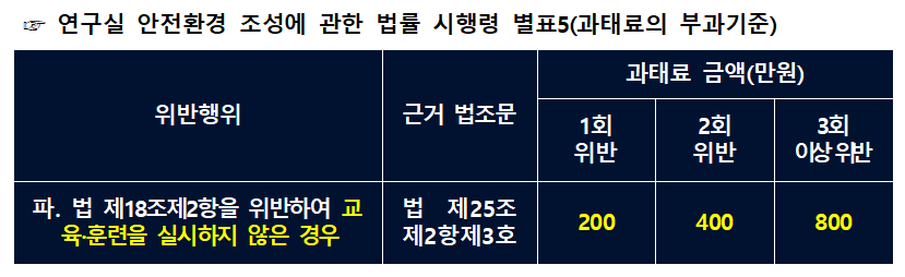 산업 안전 보건법에서는 교육을 실시하지 않은 경우 1인 당 과태료 금액이 부과되지만, 연구실 안전법에서는 인당 과태료 부과 대상이 아니라 교육, 훈련의 실시 여부에 따라 과태료 대상이 된다는 차이점이 있습니다.