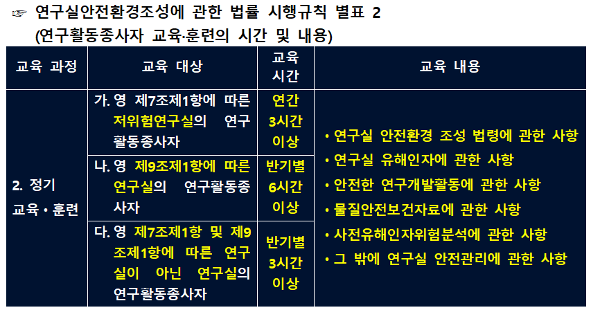 시행규칙 별표 내용에 따라 저위험 연구실의 경우 연간 3시간, 정밀안전진단 대상의 연구실의 경우 반기별 6시간, 정기점검 및 정밀진단 대상이 아닌 연구실의 연구활동 종사자의 경우 반기별 3시간 실시하면 되겠습니다.
