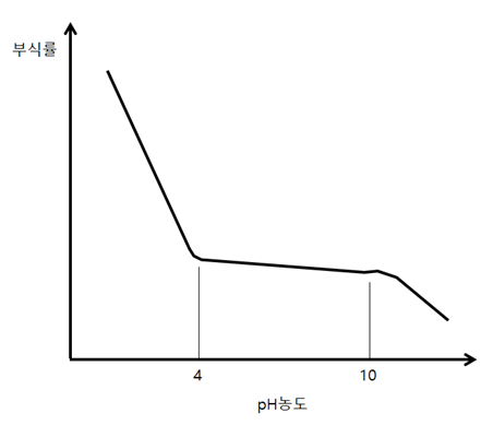 위 사진은 pH농도에 따른 부식률을 나타내며, pH가 4보다 낮은 경우 위에서 말한 대로 산화막이 용해되어 다시 진행된 부식으로 인해 부식률이 높아지게 된다. pH가 4에서 10 사이에 있는 경우 pH의 영향을 거의 받지 않으며, 10이 넘은 경우 부동화를 촉진시켜 부식률이 점점 낮아지게 된다.