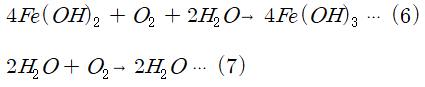 수중에 용존산소가 존재하는 경우 Fe(OH)2 및 H2는 각각 아래와 같이 산화된다.