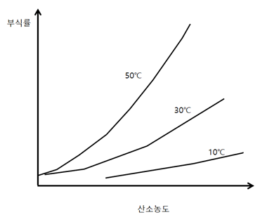 위 사진은 여러 온도에서 용존산소의 농도에 따른 부식률을 나타내며, 용존산소의 농도가 높아질수록 부식률이 높아지는 것을 확인할 수 있다. 온도가 높아짐에 따라 부식률이 높아지는 이유는 같은 산소농도에 있더라도 온도가 올라가면 용존산소의 확산속도가 빨라지기 때문이다.