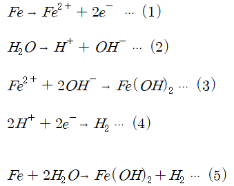 물에 접촉하고 있는 금속은 (1)과 같이 Fe이온이 용출되고, 금속에는 전자(e)가 남게 된다. 그와 동시에 물은 (2)와 같이 전리되며, (1),(2)의 결과 (3)과 같이 Fe(OH) 2가 생성, (4)에 의해 수소가 생성된다.