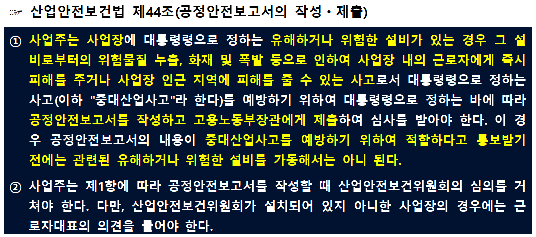 중대 산업사고 발생 위험이 큰 유해, 위험설비를 보유한 사업장에 대해 공정 안전 자료 , 공정 위험성 평가, 안전 운전 계획, 비상조치 계획 수립 등에 관한 보고서를 작성하도록 정하고 있는데요.