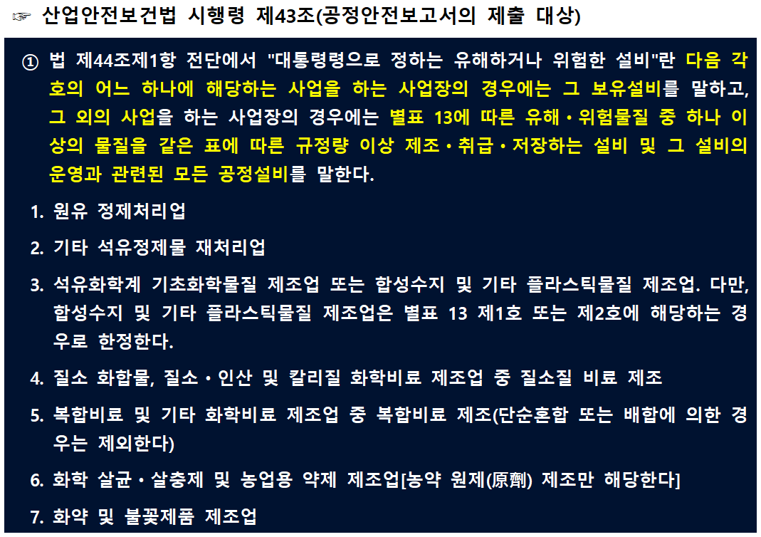 산업안전보건법 제44조(공정안전보고서의 작성ㆍ제출)에 따라 7개의 제출 대상 업종이거나 산업 안전 보건법 시행령 별표 13에 따른 PSM 제출 대상 물질 51종 중 규정량 이상을 사용하는 경우 대상이 됩니다.